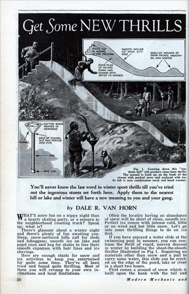 Continuing Modern Machanix apparent quest to kill all ice skaters, in 1933 they decided to turn their wrath towards children. In one part of a four page spread detailing numerous incredible ways to cut swathes through the child population of America they accidentally invented downhill skating.